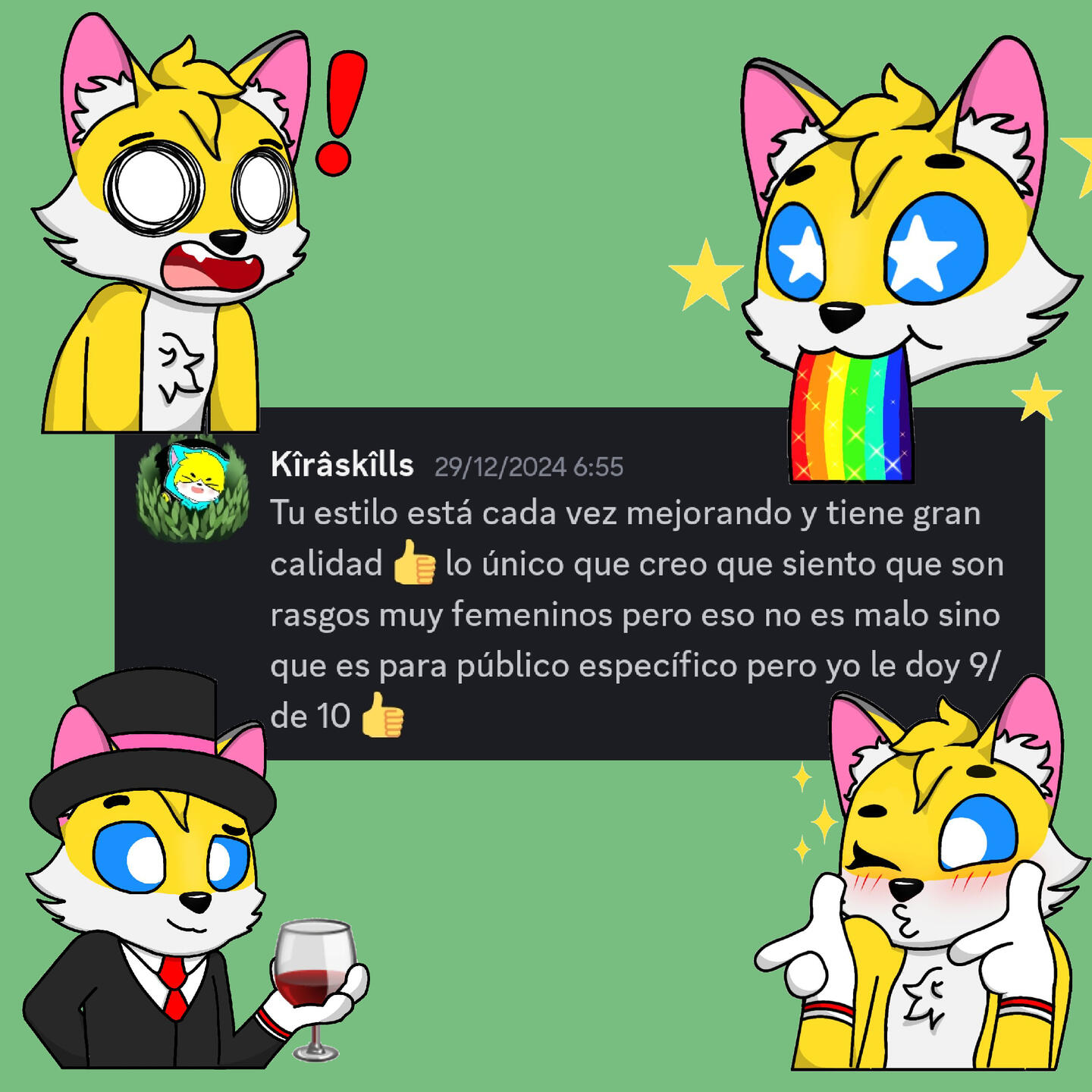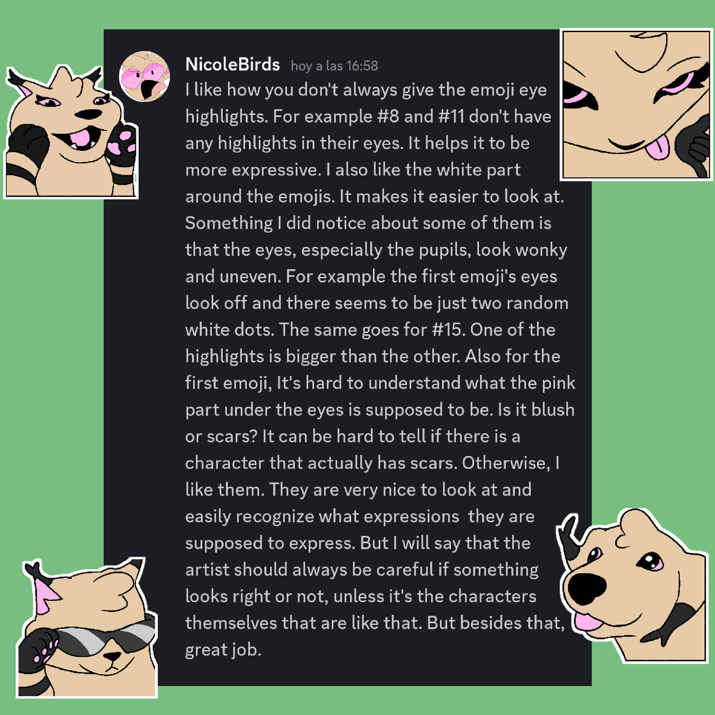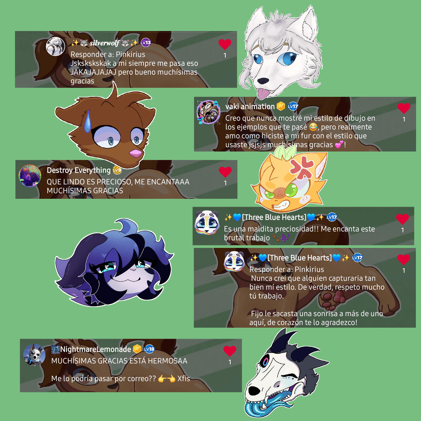 El 9 de Enero hice un pequeño evento donde hiba a dibujar personajes originales de la comunidad furry en Amino, llegaron a participar 9 pero lastimosamente un usuario abandonó la comunidad así que hice 8 emojis, cada uno con un estilo diferente, pues intenté repicar el estilo del artista con las referencias que proporcionaron, aquí hay algunos comentarios al finalizar el evento.